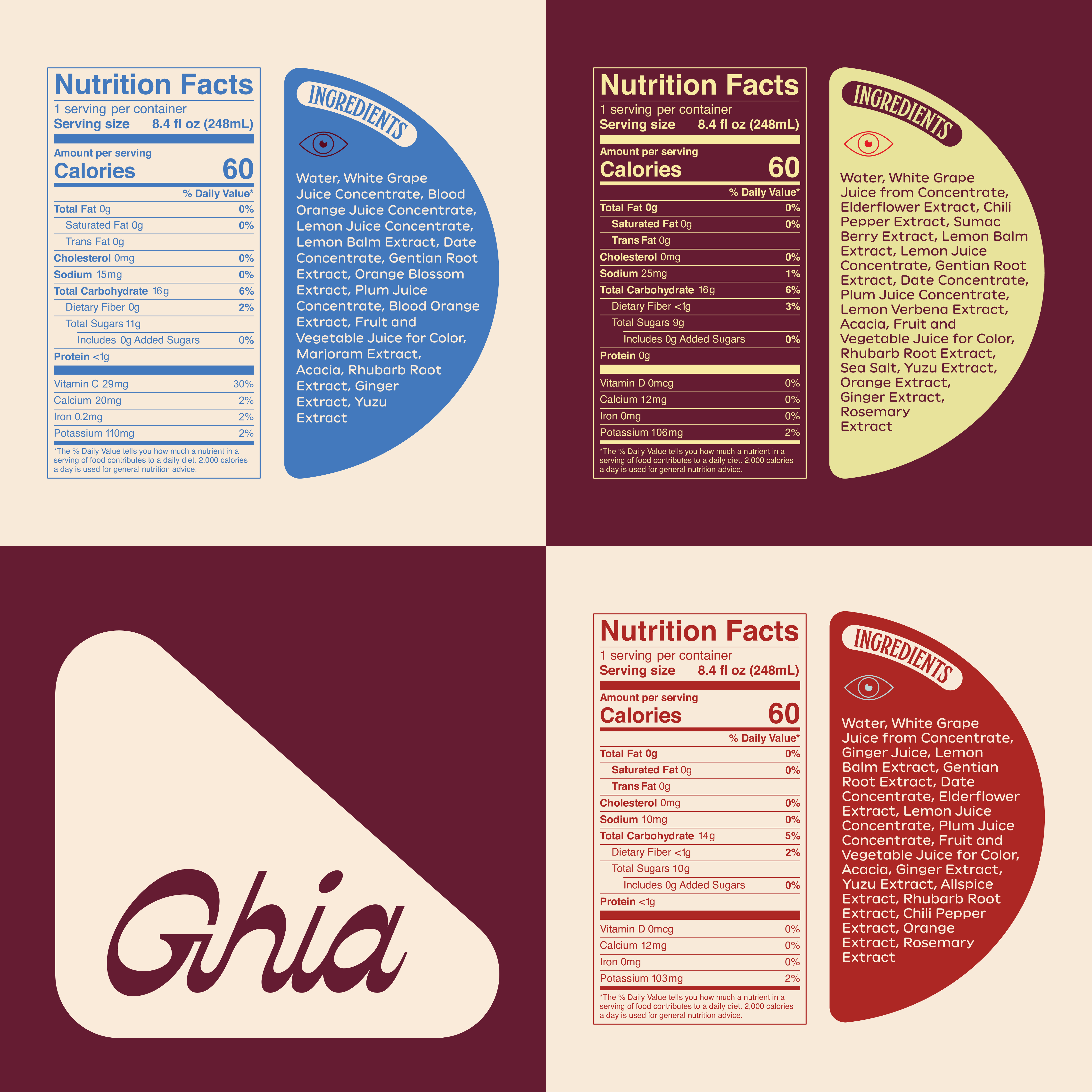 Blood Orange: Water, White Grape Juice Concentrate, Blood Orange Juice Concentrate, Lemon Juice Concentrate, Lemon Balm Extract, Date Concentrate, Gentian Root Extract, Orange Blossom Extract, Plum Juice Concentrate, Blood Orange Extract, Fruit and Vegetable Juice for Color, Majoram Extract, Acacia, Rhubarb Root Extract, Ginger Extract, Yuzu Extract.